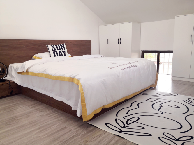 怀柔山沐茶居民宿,全套房屋面积500余平米,客房共计8间,可以容纳20人左右住宿,房型设有,大床房,双人间,三人间,榻榻米等,房屋设计简约又不失格调,宽敞明亮,每个房间采光光照好,配有落地窗,安静,惬意,客房内也是以原木色与白色为主基调。