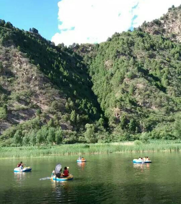 烤 虹鳟鱼、酱炖野生河鱼、鱼头泡饼、炸河虾、炸小鱼、柴鸡炖蘑菇、烤全羊(预定)、烤肉串、龙须菜、木兰菜、自家菜园的时令菜等可口的农家饭菜。坐在菜园子里边欣赏着周围青山的自然美景,边吃着新鲜的农家饭菜,可谓是再惬意不过的享受了!吃饱喝足您可乘坐皮艇到河中漂流,水流忽而湍急,忽而平缓,有惊无险!两岸高山峻岭,悬崖陡壁如刀削斧砍,苍松翠柏傲立崖间,岸柳轻扬,河草淒淒,河水清澈见底,小鱼小虾嬉戏在水底,让您体会到亲近大自然的感觉!